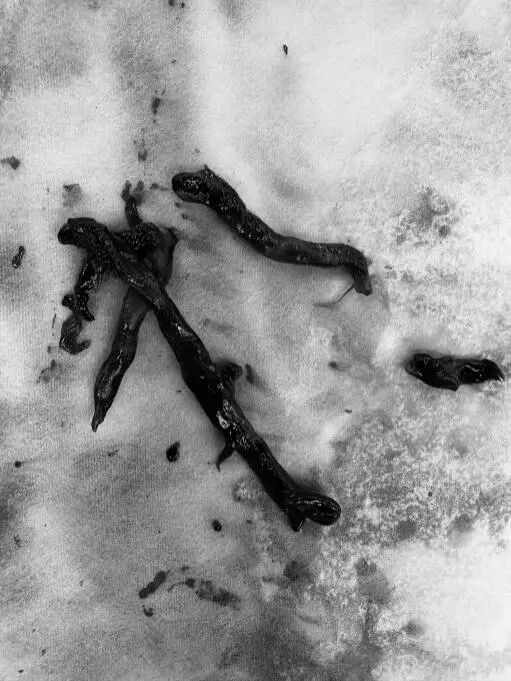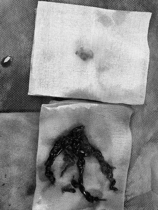 患者1-术中取出的肺内血栓(上图左肺,下图右肺)