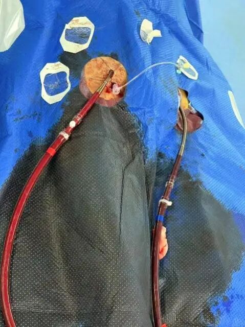 ICU张庆海主任、朱贵伟、石耀璞主治医师与血管外科张杰峰主任医师团队讨论评估,考虑患者为高危致死性肺栓塞,决定先为患者施行ECMO保障护航,随即准备急诊行肺动脉机械取栓术。