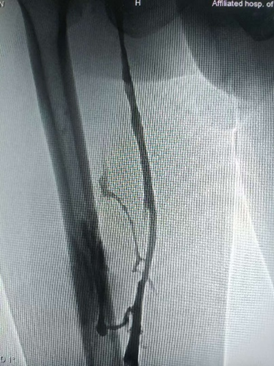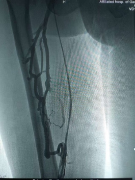复查造影显示右下肢深静脉血流恢复通畅,拔除血管鞘,局部纱布压迫止血,包扎固定,术毕安返病房。