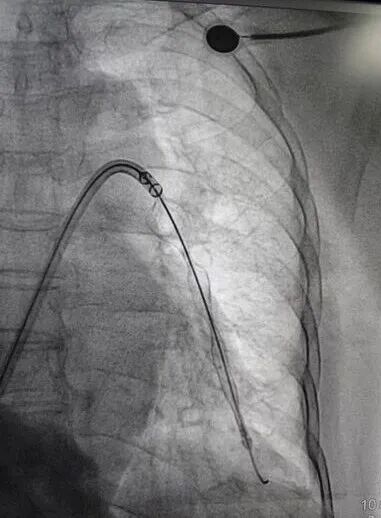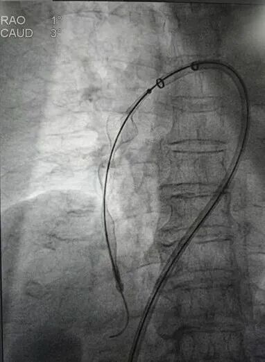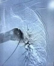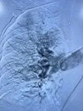 追加注入肝素2000u,于右股静脉交换置入18F鞘管,沿加硬导丝送入腾复血栓抽吸导管于左下肺动脉,行负压抽吸可抽出较多暗红色血栓,送入肺动脉取栓支架系统于左下肺动脉行取栓术,可取出较多暗红色血栓。复查造影提示左下肺动脉未见明显血栓,血流明显改善,测得肺动脉压力下降至40/3mmHg。