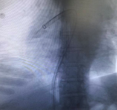 更换置换 22F 血管鞘 , 送入Tendvia®抽栓导管置于右肺动脉血栓近端行血栓抽吸治疗 , 抽取大量红色血栓。将Tendvia®肺动脉取栓支架沿导丝通过抽吸导管向前推送⾄右肺动脉血栓位置,支架头端穿过血栓 ,回撤输送鞘管
