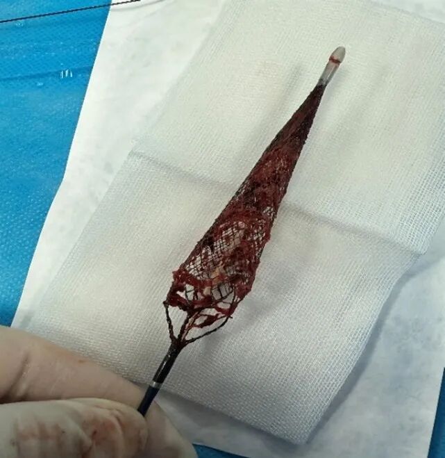 在导丝引导下将抽吸导管送至目标血管位置,抽出部分血栓后,沿导丝置入Tendfast取栓支架至预定位置。回撤输送鞘管释放支架,锁定推送管并调整支架支撑力,使其充分嵌入血栓。当回撤支架至抽吸导管口时,连接负压抽吸装置,在持续负压下缓慢将取栓支架撤出体外。反复多次,拉出大量暗红色血栓,拉栓效果满意。