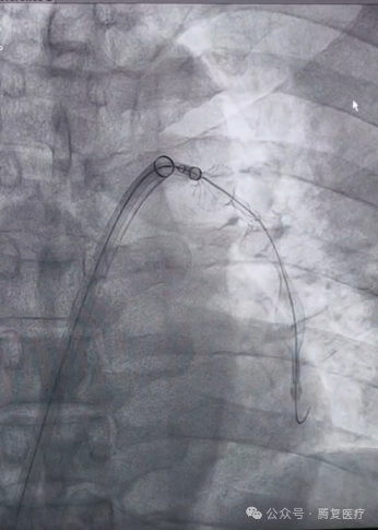 患者仰卧位,局麻后经股静脉穿刺放置血管鞘,引入导丝和导管,建立右心房-右心室-肺动脉通路。韩宝石教授团队将Tendvia®血栓抽吸导管,沿导丝推送至肺动脉。管口贴近血栓处停止,撤出导管芯。并将Tendvia®肺动脉血栓取支架沿导丝通过抽吸导管向前推送,精确导入到患者的肺动脉血栓部位。再回撤输送鞘管,支架自动膨开。连接抽吸器并形成负压,回撤取栓支架的同时旋转开关释放负压。最后,Tendvia®肺动脉取栓支架捕获和收集血栓进入抽吸导管,经负压抽吸同步的作用下,顺利为患者取出了血栓。